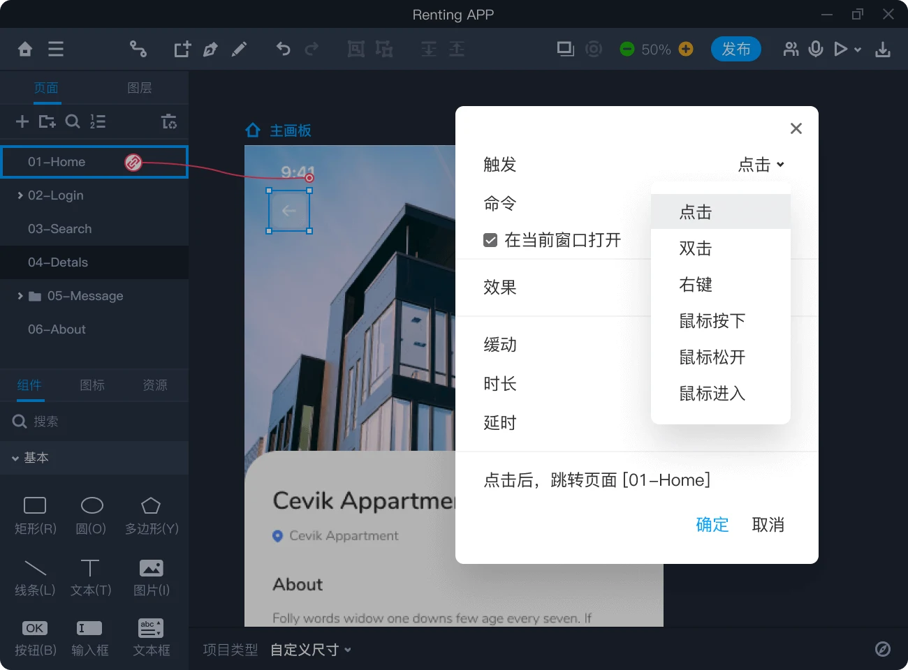 支持双击、鼠标移动等多种触发方式和曲线、延时等多种交互效果,App交互动效更丰富