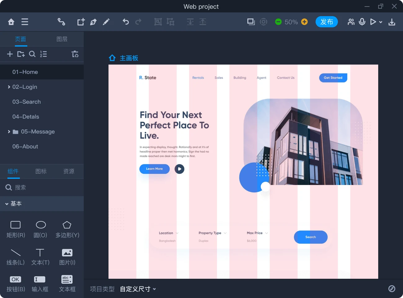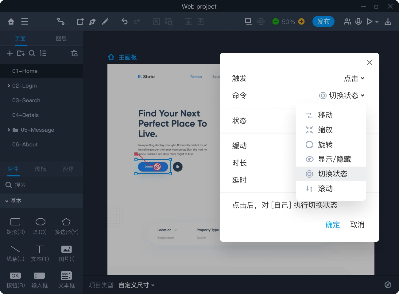 项目页面搭配主辅画板模式,自由创建弹窗、内容切换等网页中常见交互,轻松打造功能结构完整,流程清晰的网页原型