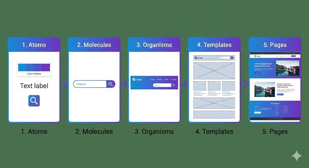 原子设计将复杂的界面拆解为五个清晰的层级,理解原子设计的关键就在于:弄清楚每一层到底解决什么问题、边界在哪里。下面我们按从小到大的顺序,一层一层解析。