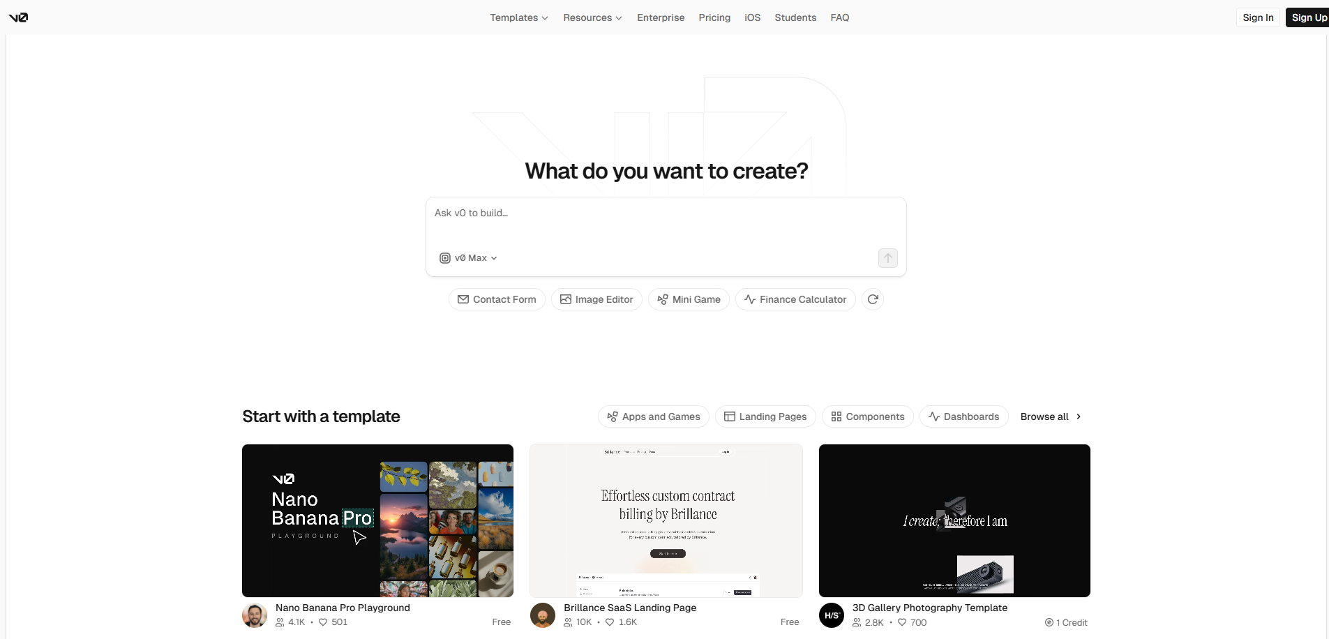 v0 由前端部署巨头 Vercel 推出,代表了 AI 驱动 UI 生成的新巅峰。你只需通过自然语言描述,它就能瞬间生成基于现代前端栈的高质量代码,是快速原型构建和 UI 开发的“闪电侠”。